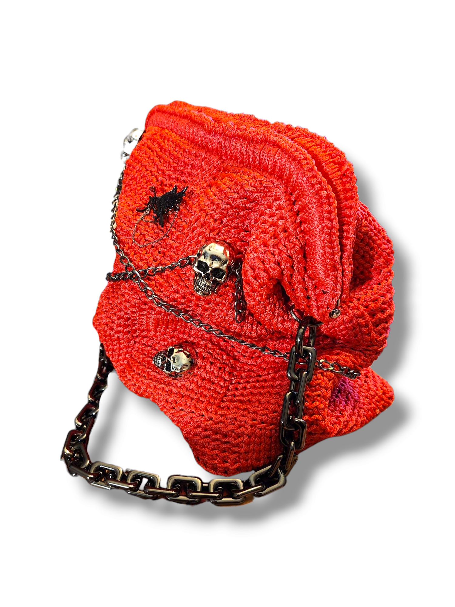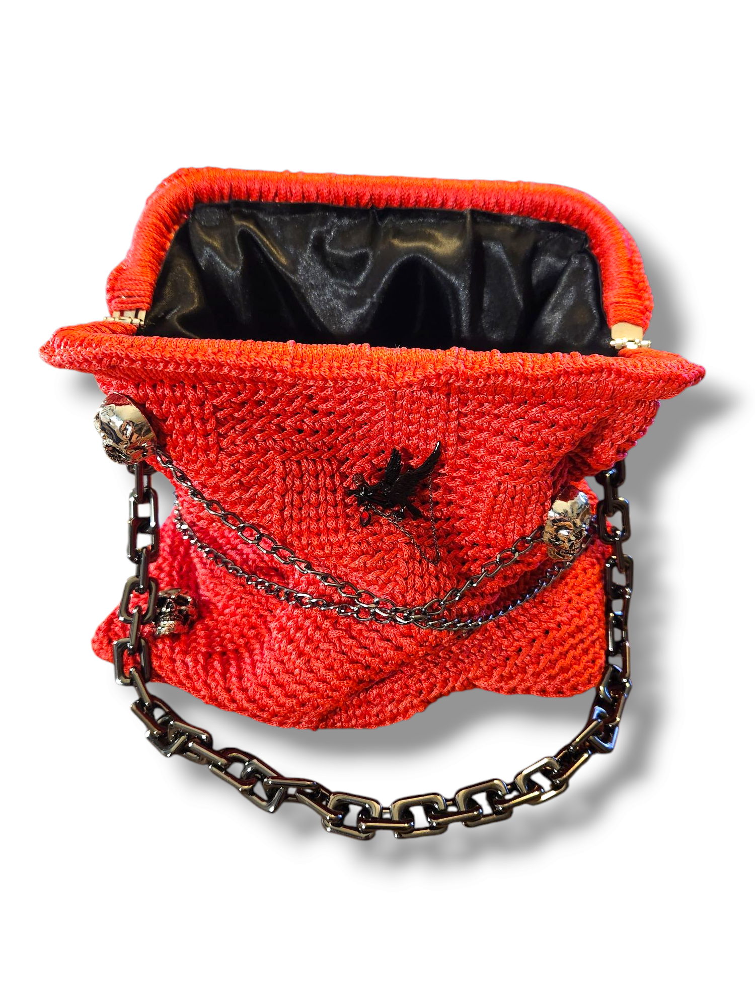 Don’t let the romantic bloom fool you—Iron Rose is a bag with bite. This fire-toned stunner is crafted from bold 3mm rope and armored with black skull embellishments, dramatic chain detailing, and a heavy-duty clamshell frame. Inside, it’s lined in sleek silk for a striking contrast of texture and tone.