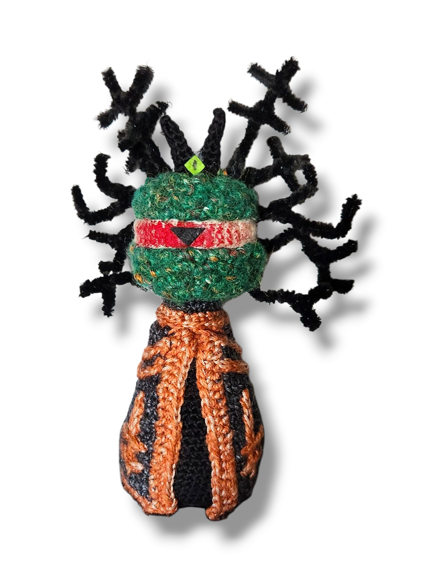 Inspired by nature’s darker myths and a certain leafy nemesis from the cult classic you may recognize, The Forest Herald brings woodland chaos with a side of unsettling charm. Crocheted in rich green and deep black acrylic yarn, he’s cloaked in an embroidered robe and topped with a crown of movable pipe-cleaner totems.