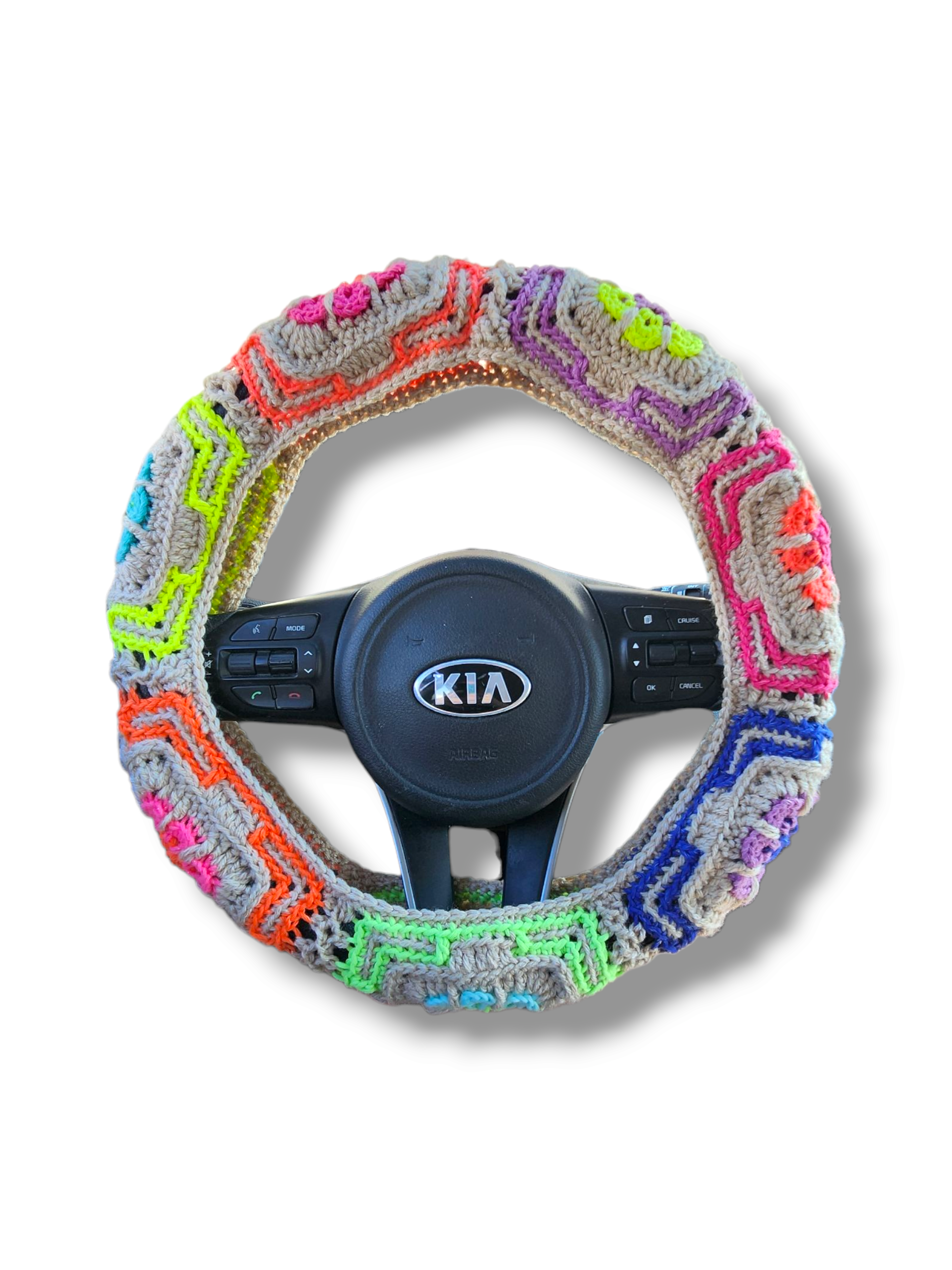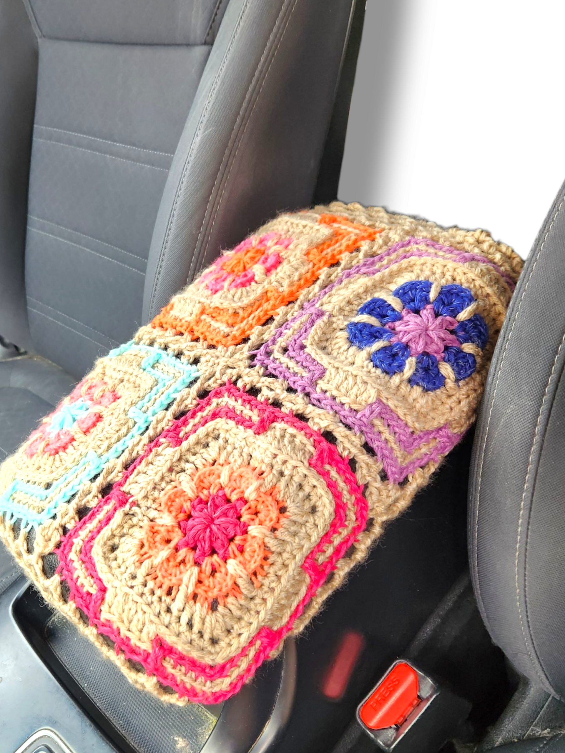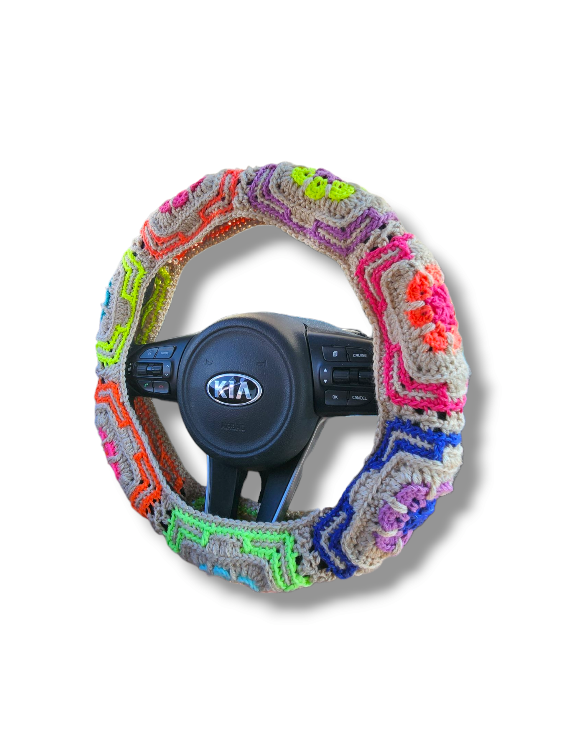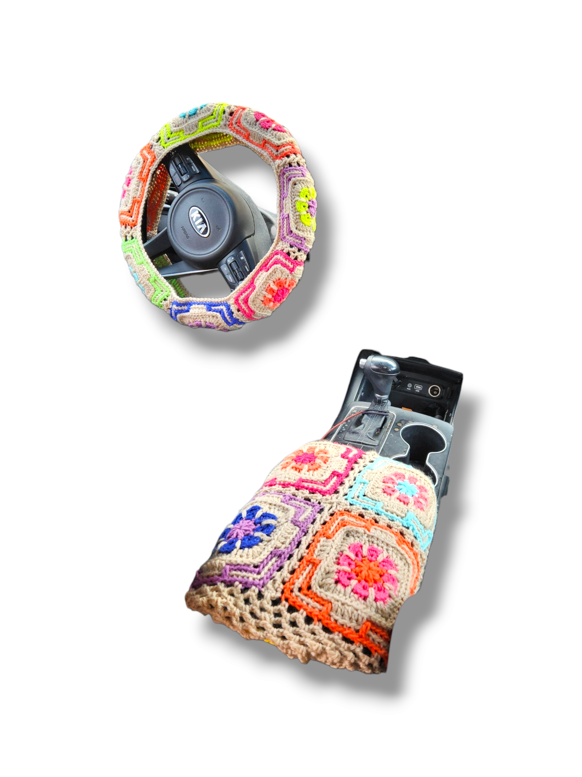 Go full nuclear on climate change with the complete car protection set! Steering wheel cover AND center console cover in matching granny square rebellion. Transform your entire front seat area into a rainbow fortress against whatever fresh hell the weather is serving up today.